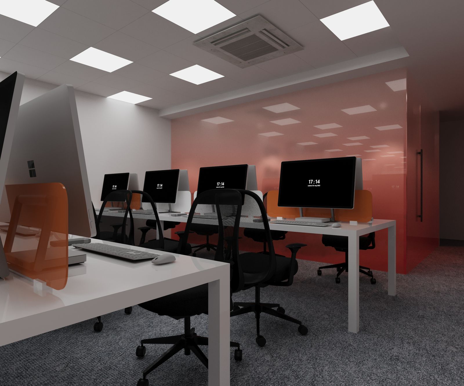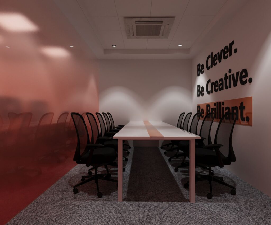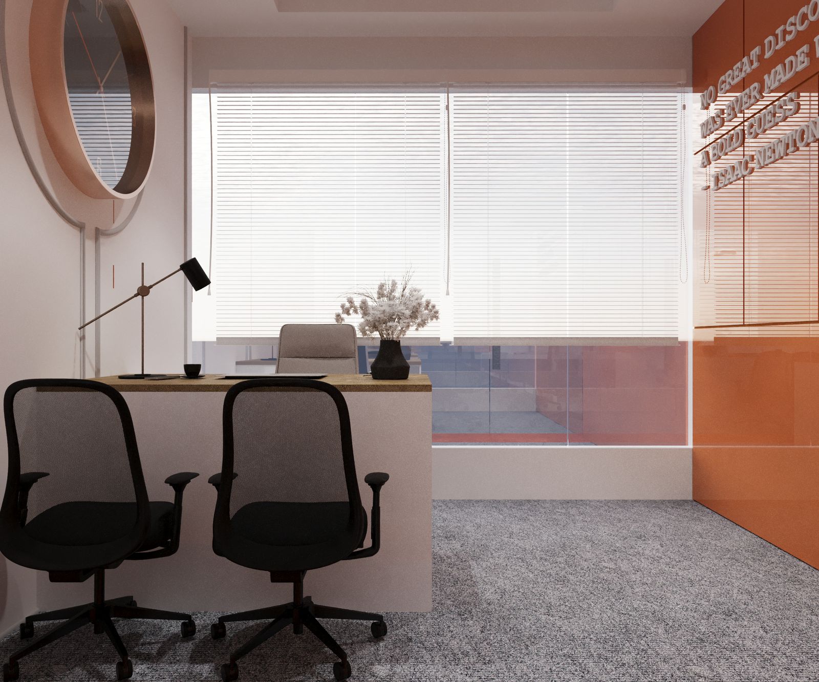 “Where first impressions meet bold expressions. This reception area combines a striking orange hue with sleek, sophisticated details, setting the tone for a workspace that means business with style.”